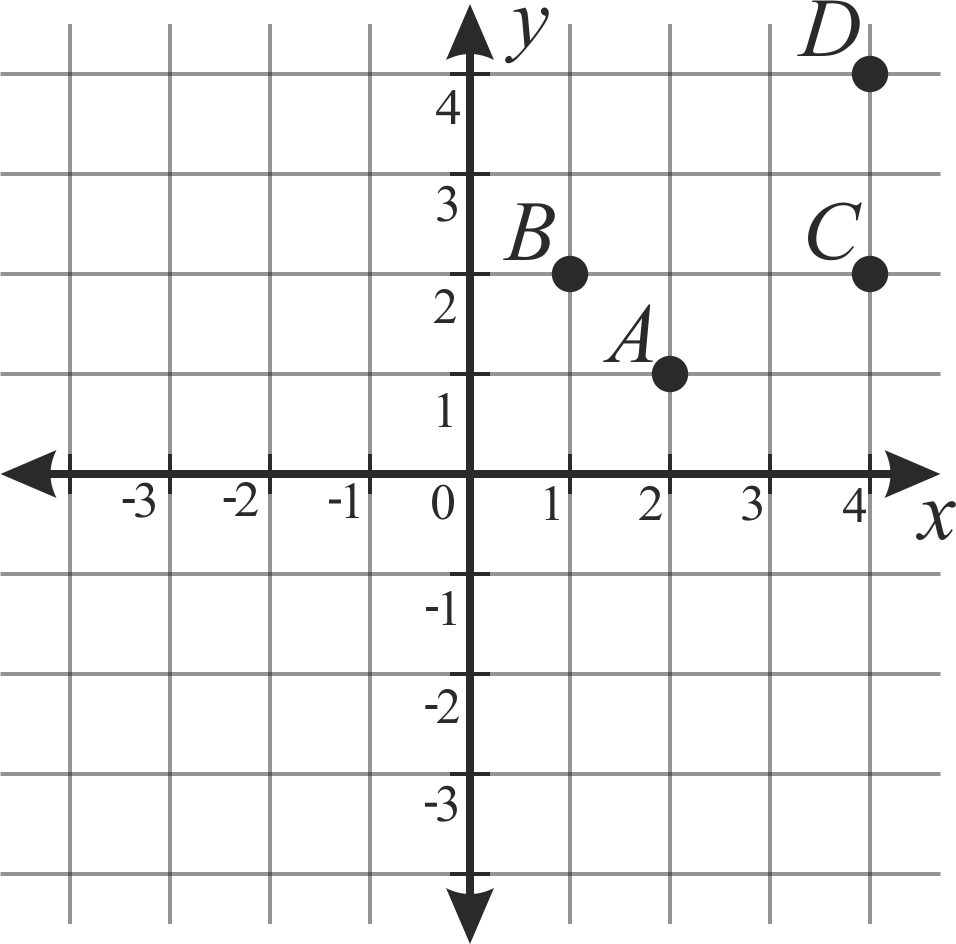 $C$ is 4 units to the right of and 2 units above the origin so point $C$ is $(4,2)$