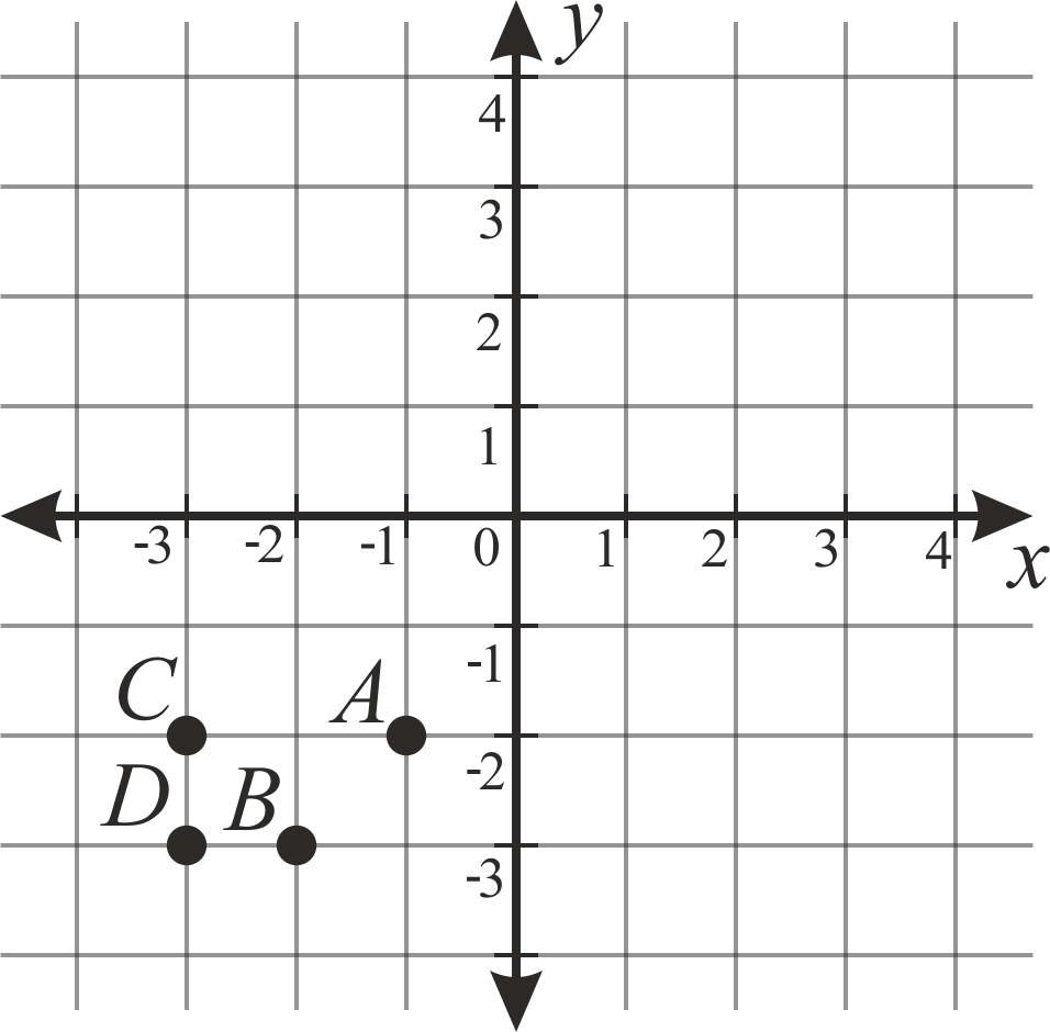 $D$ is 3 units to the left of and 3 units below the origin so point $D$ is $(-3,-3)$
